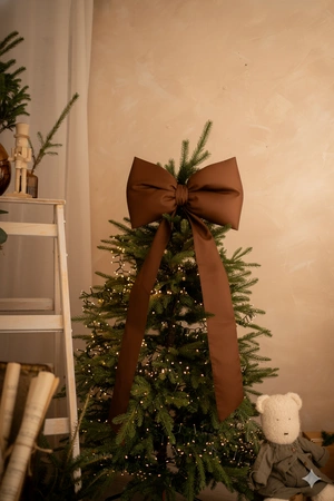 Duża, elegancka kokarda w głębokim brązie, która od razu „robi” święta. Odcień ciepły,nasycony-pięknie dociepla przestrzeń. Na zdjęciu widzisz ją w roli toppera – pięknie wieńczy ośnieżoną choinkę, a długie szarfy miękko opadają wzdłuż gałązek, podkreślając światło lampek. To ten jeden, wyrazisty akcent, dzięki któremu cała aranżacja wygląda spójnie i odświętnie.