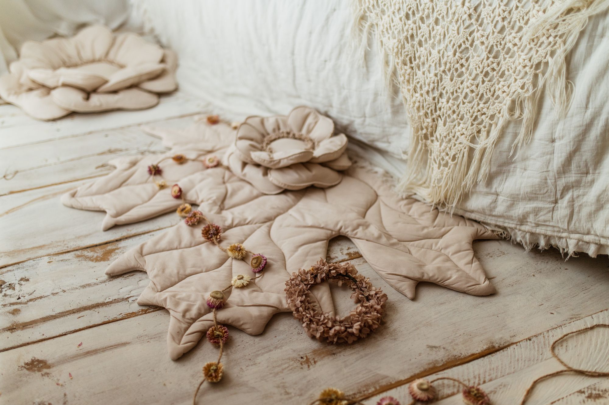 Beżowa mata klon liść bawełniana do zabawy dla dziecka