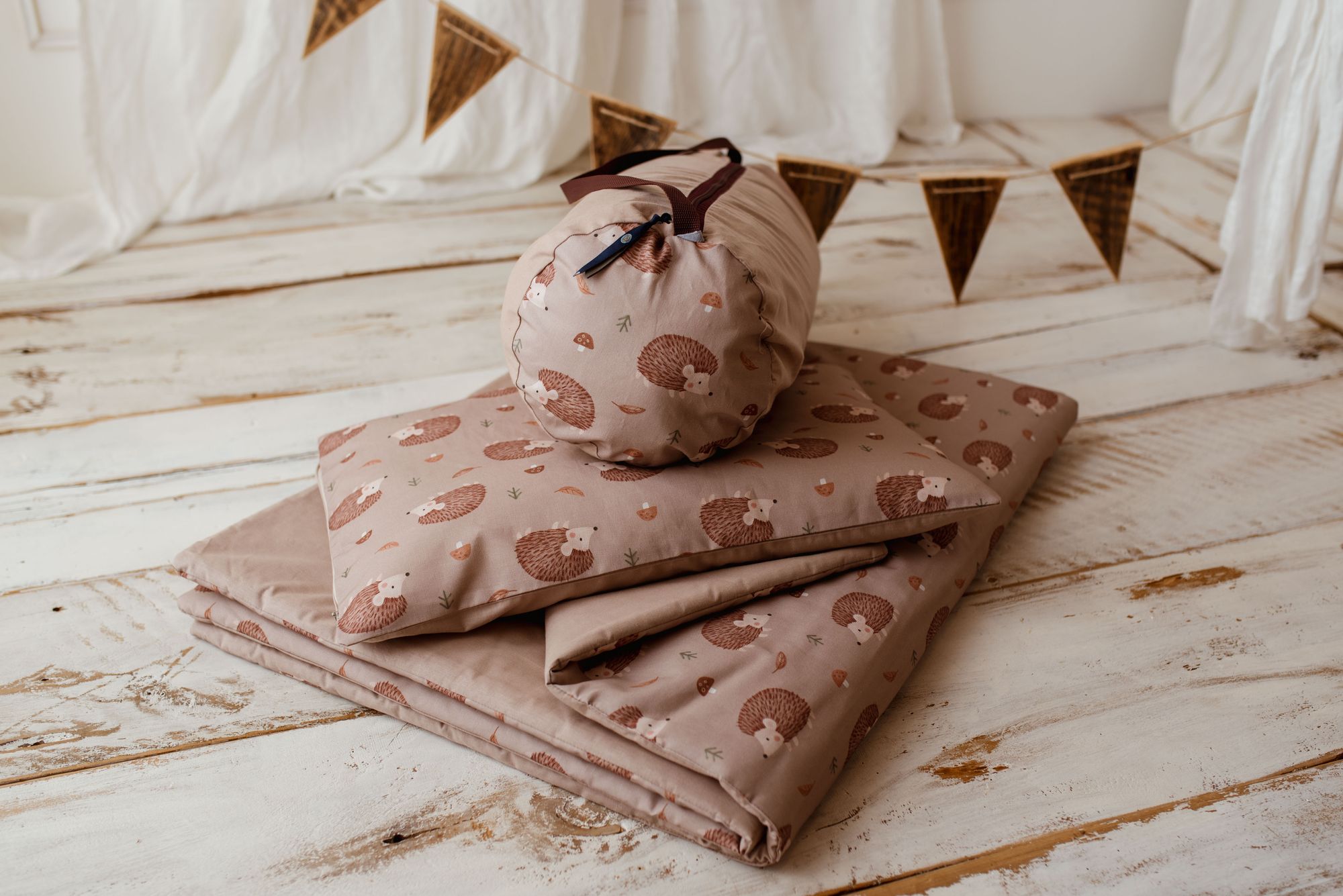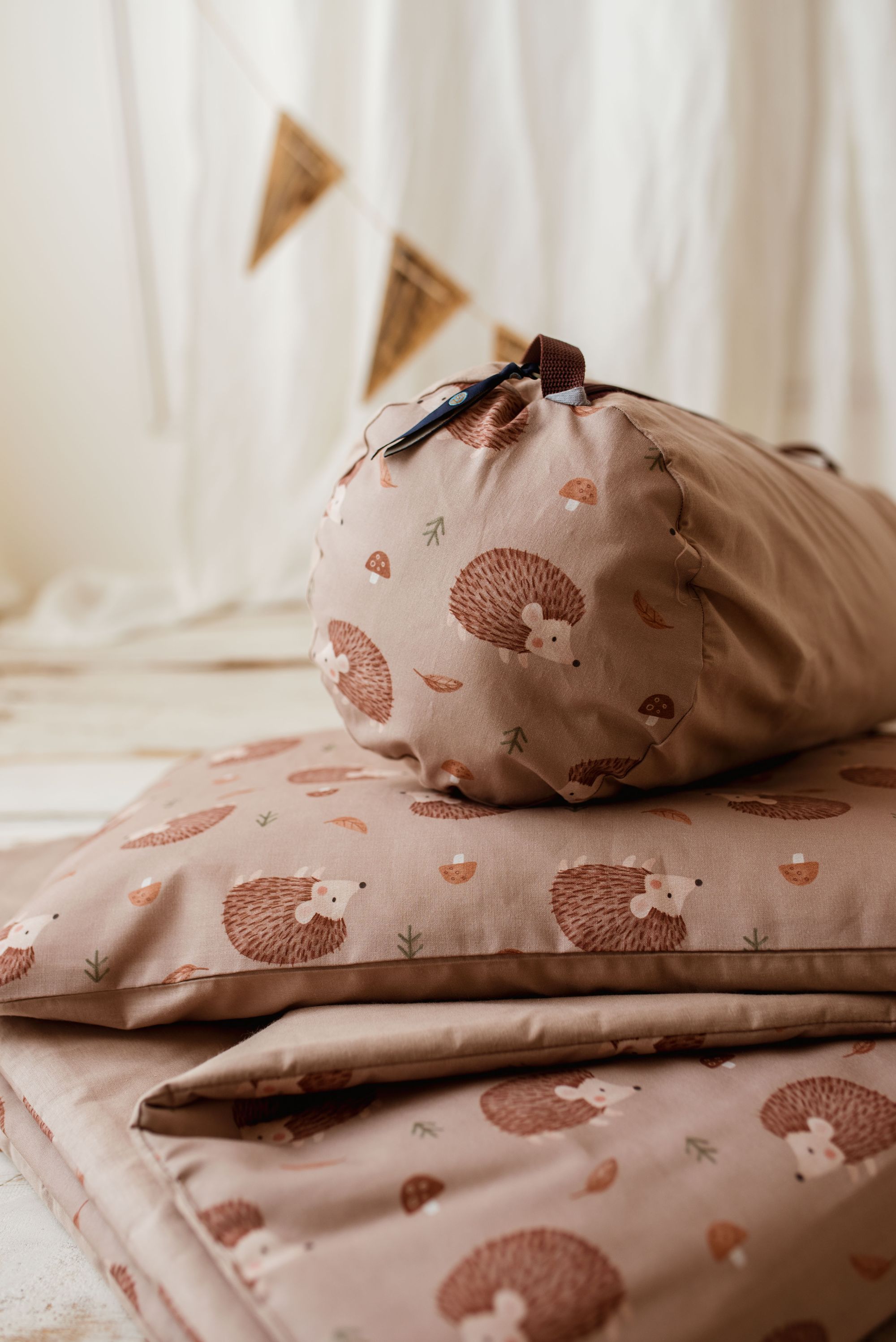 Do suwaka dołączona została urocza tasiemka , aby malutkie rączki mogły go wygodnie zamykać i otwierać:) W zestawie znajduje się poszewka na podusie wraz z wypełnienieniem  🙂 , a całość zapakowana jest w  wygodny i poręczny pokrowiec, pasujący do zestawu.