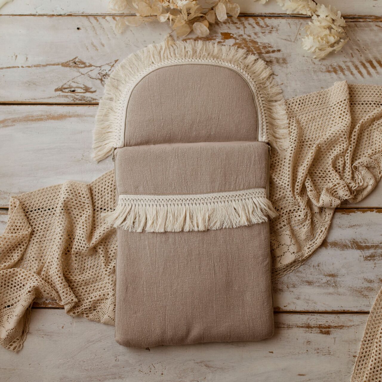 Każdy śpiworek wyróżnia się subtelnymi zdobieniami – delikatną falbanką z bawełny lub bawełnianej koronki. Dodatkowo, w ofercie znajduje się model w stylu boho ozdobiony uroczymi frędzelkami.