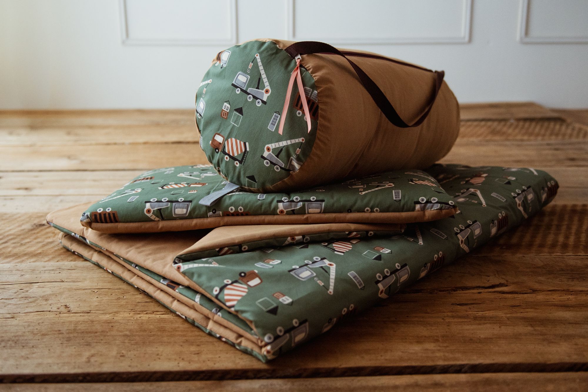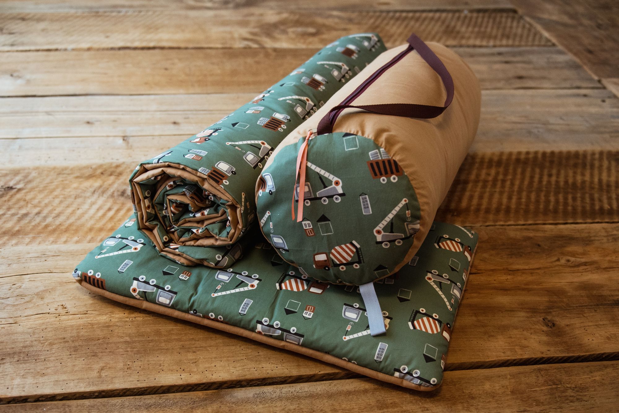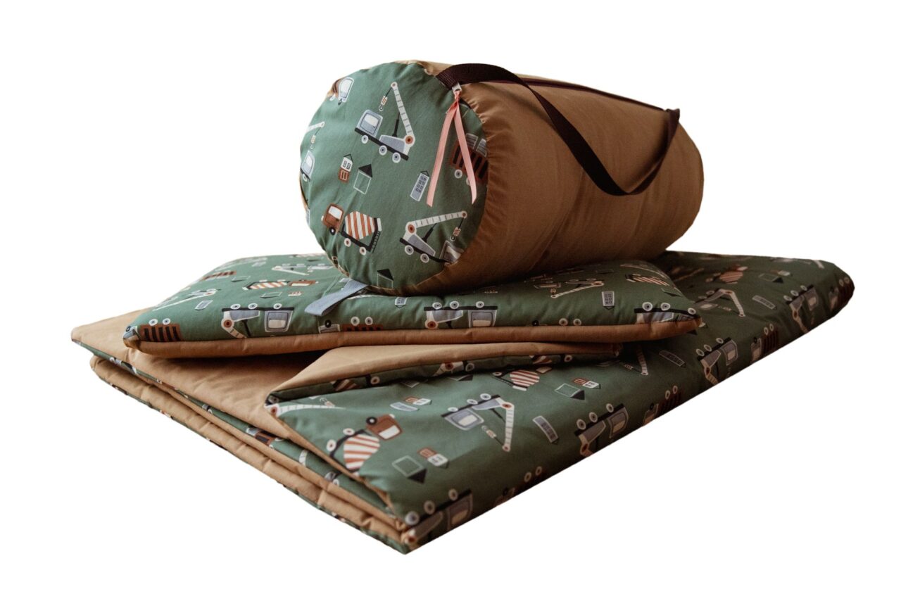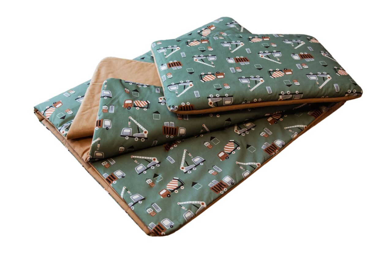 Kocyk bawełniany do przedszkola dla chłopca z poduszką auta zielone carmel