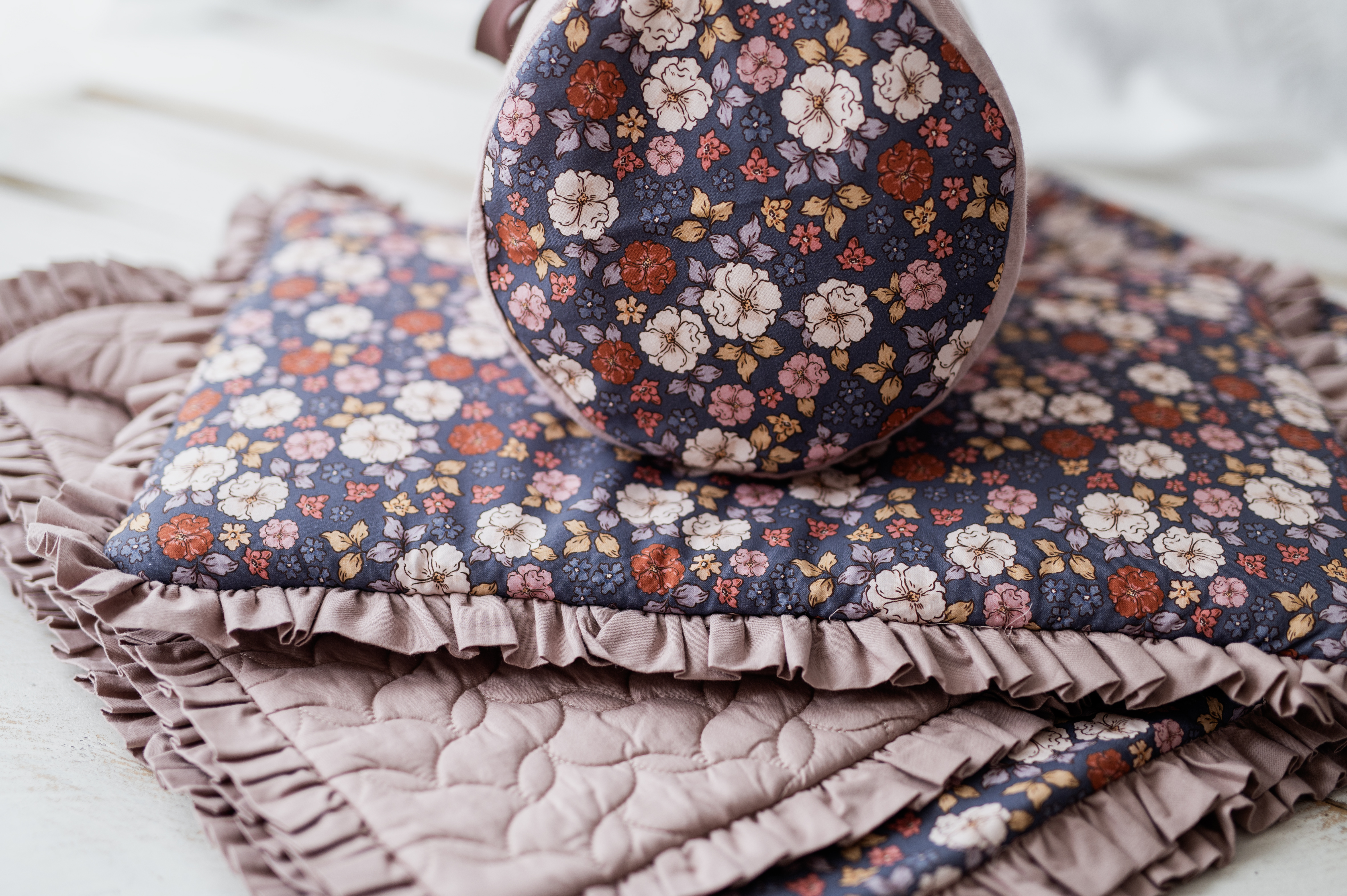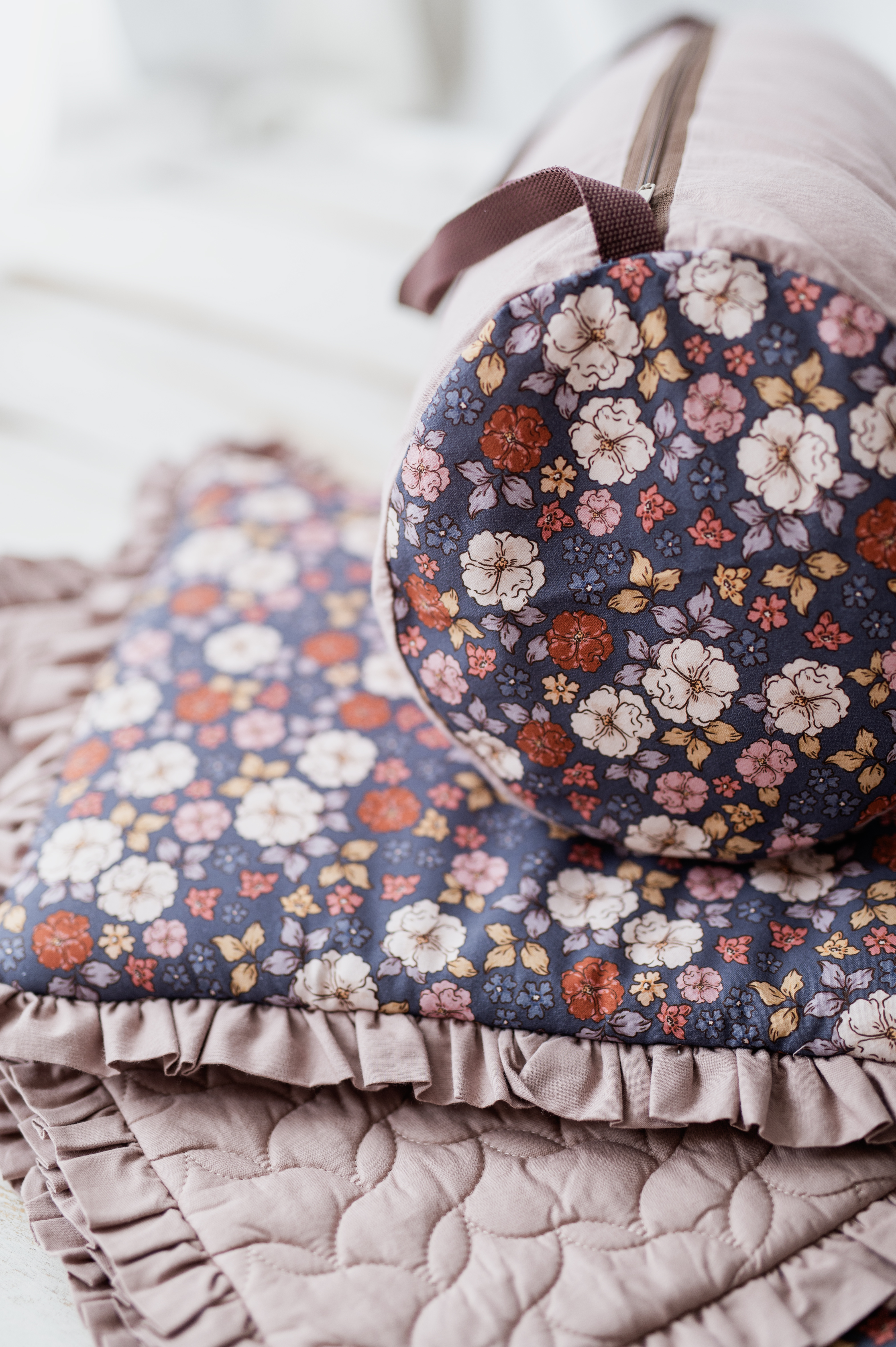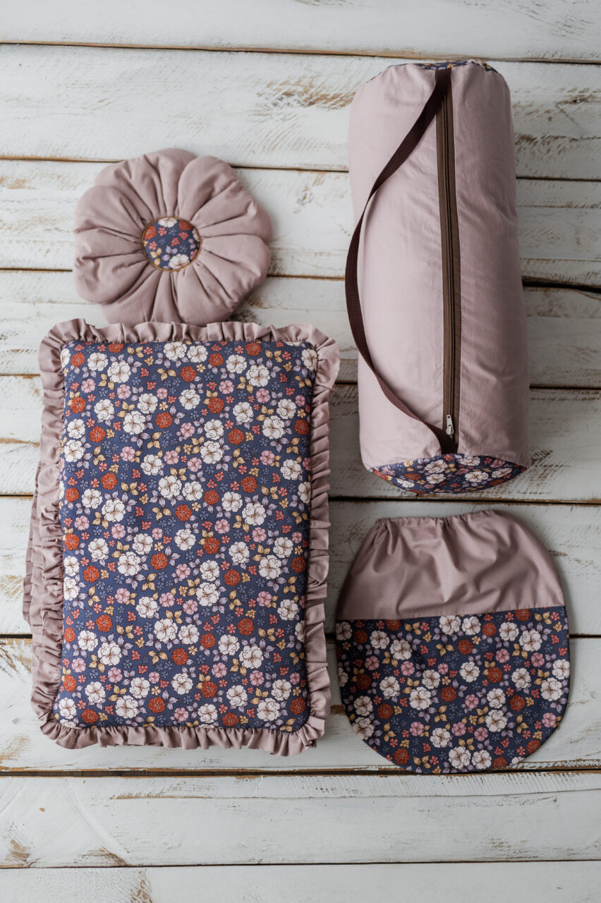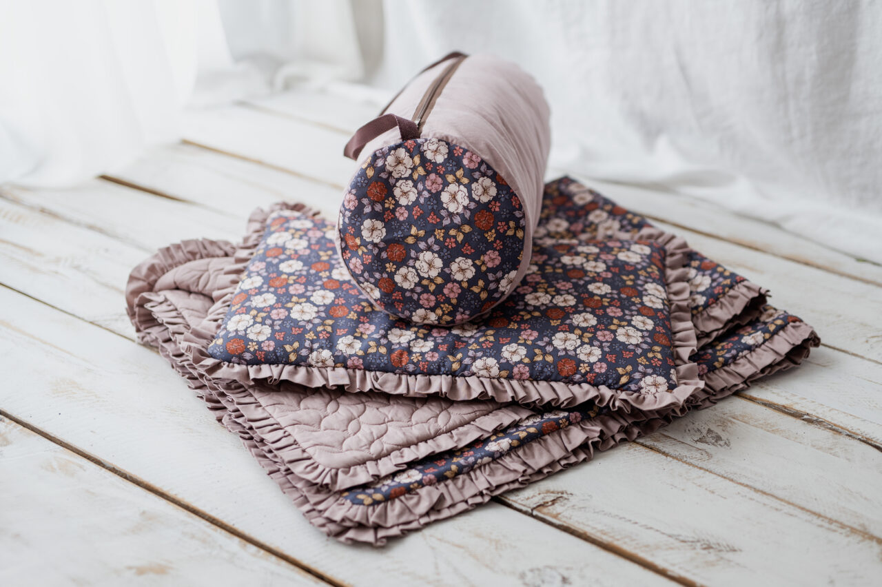 Kocyk dla dziewczynki do przedszkola z falbanką jesienne kwiatuszki