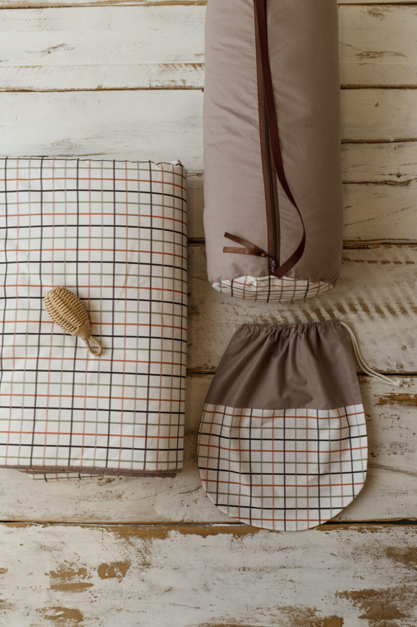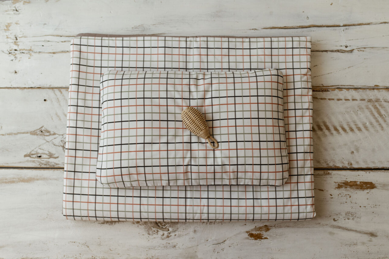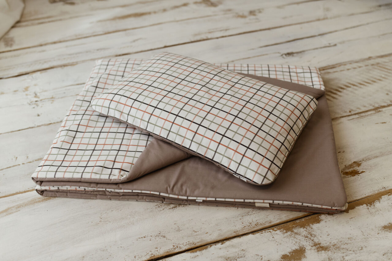 Kocyk do przedszkola brązowy w kratkę zestaw z poduszką