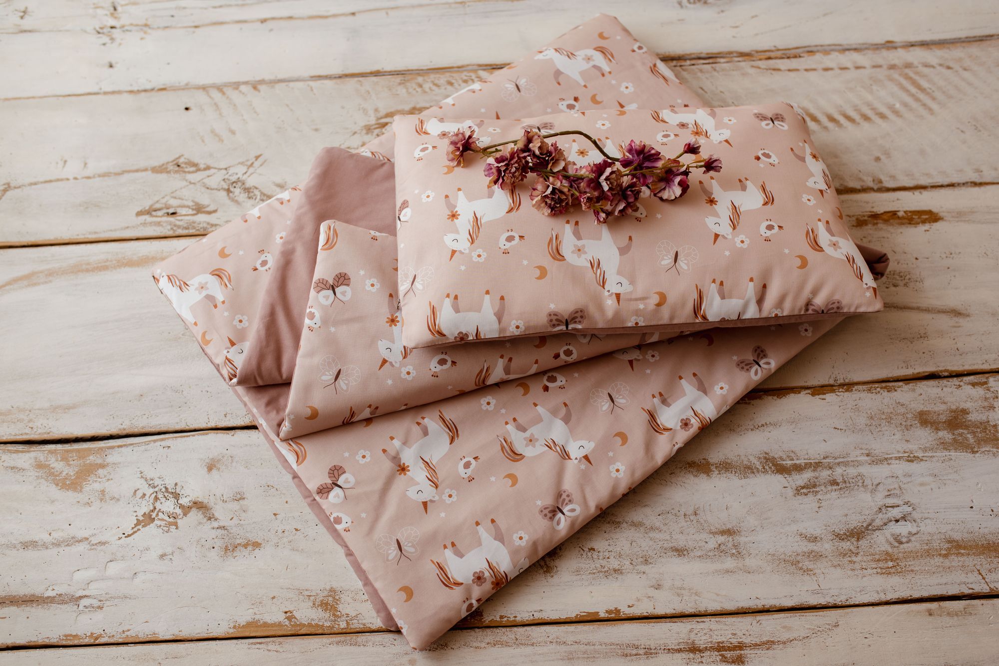 • Wypełnienie: Antyalergiczna włóknina (150 g/m² – kocyk, 500 g/m² – poduszka)