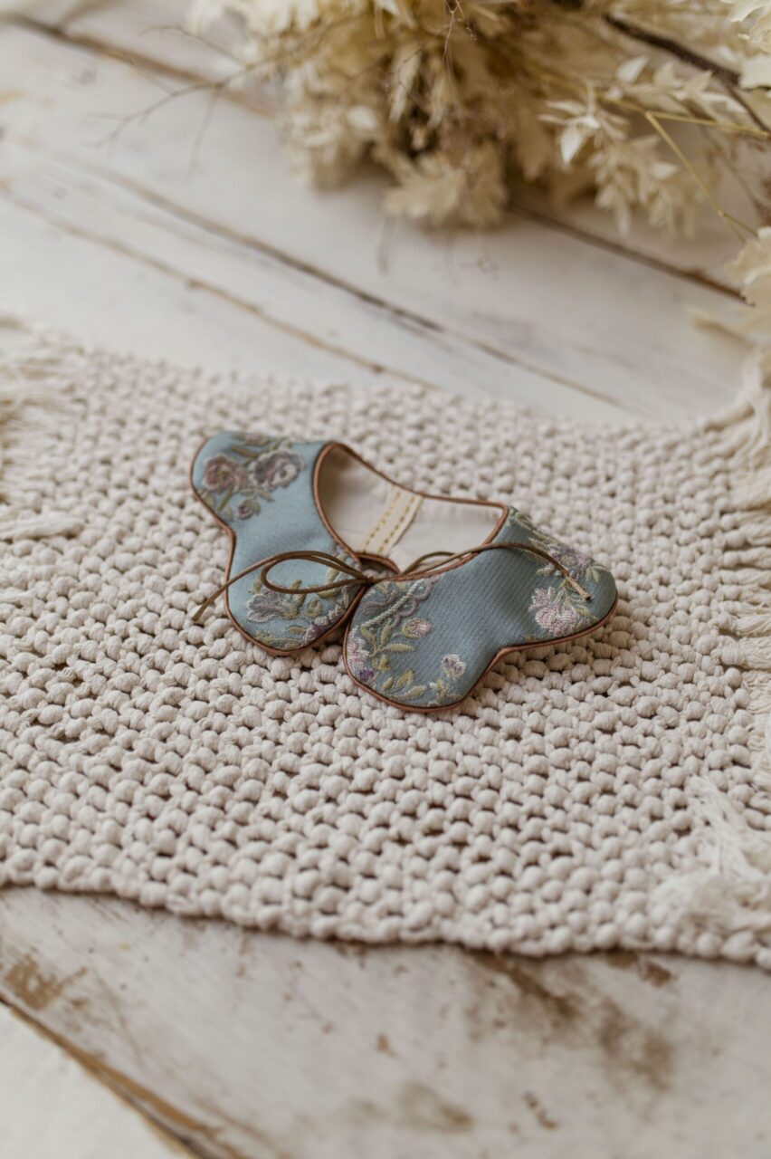 Kołnierzyk w stylu vintage – unikalny dodatek dla dziewczynki Subtelność i urok w każdym detalu Przedstawiamy uroczy kołnierzyk w pastelowym odcieniu niebieskiego, ozdobiony delikatnym florystycznym haftem.
