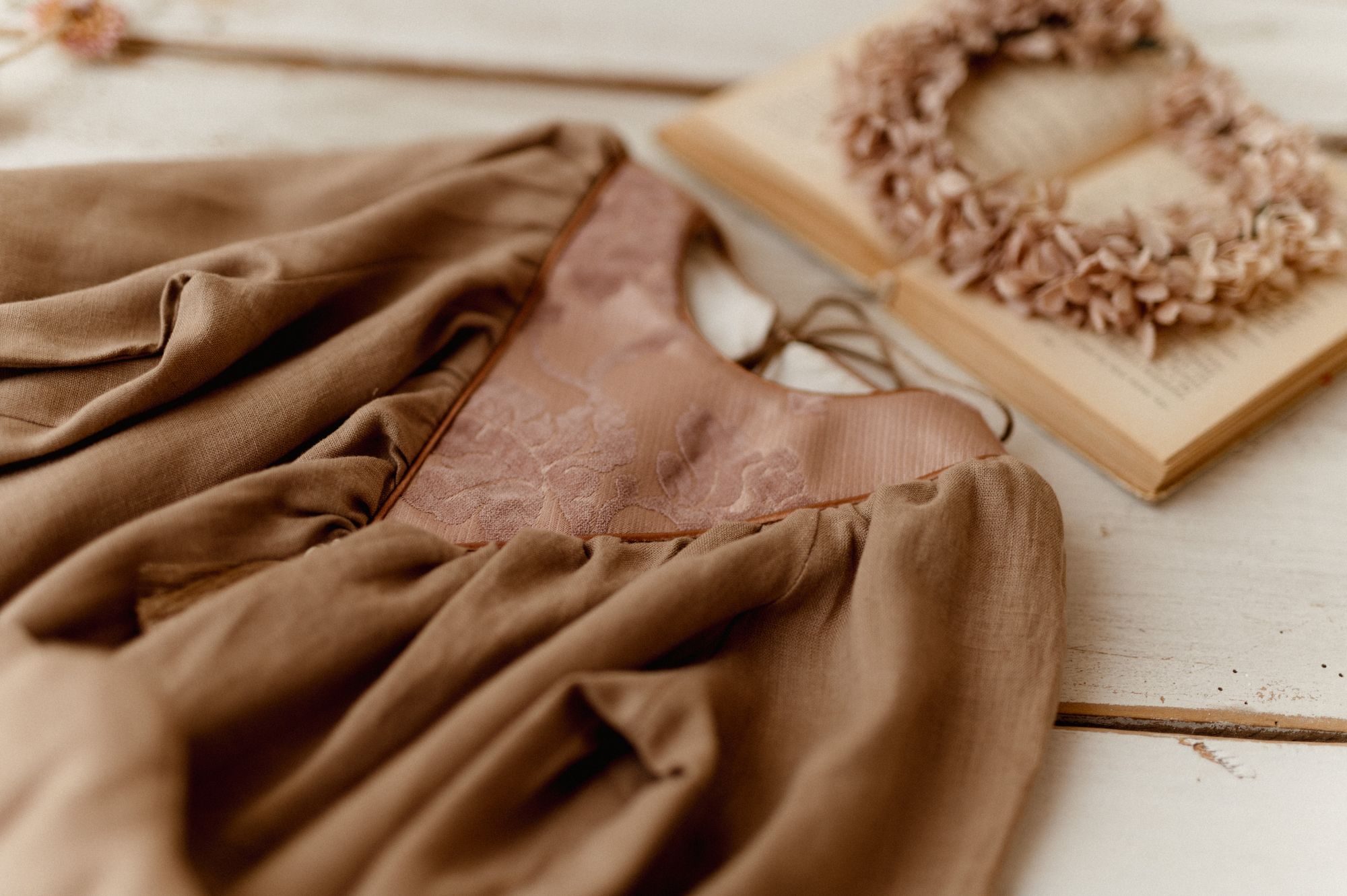 Lniana sukienka szyta  z 100%  litewskiego lnu  typu stonewashed. fason luźny i wygodny. Idealna na wszelkie uroczystości, czy do sesji zdjęciowych. Krój sukienki ponadczasowy w stylu vintage. Sukienka do kolana z długim  ,zbluzowanym rękawkiem, wykończonym gumeczką.  Uzupełnieniem stylizacji może być jeden z naszych cudownych kołnierzyków , kamizelka czy różdżka. Piękny żakardowy dekolt  podkreślony starannie wypustką i chwościkiem:)