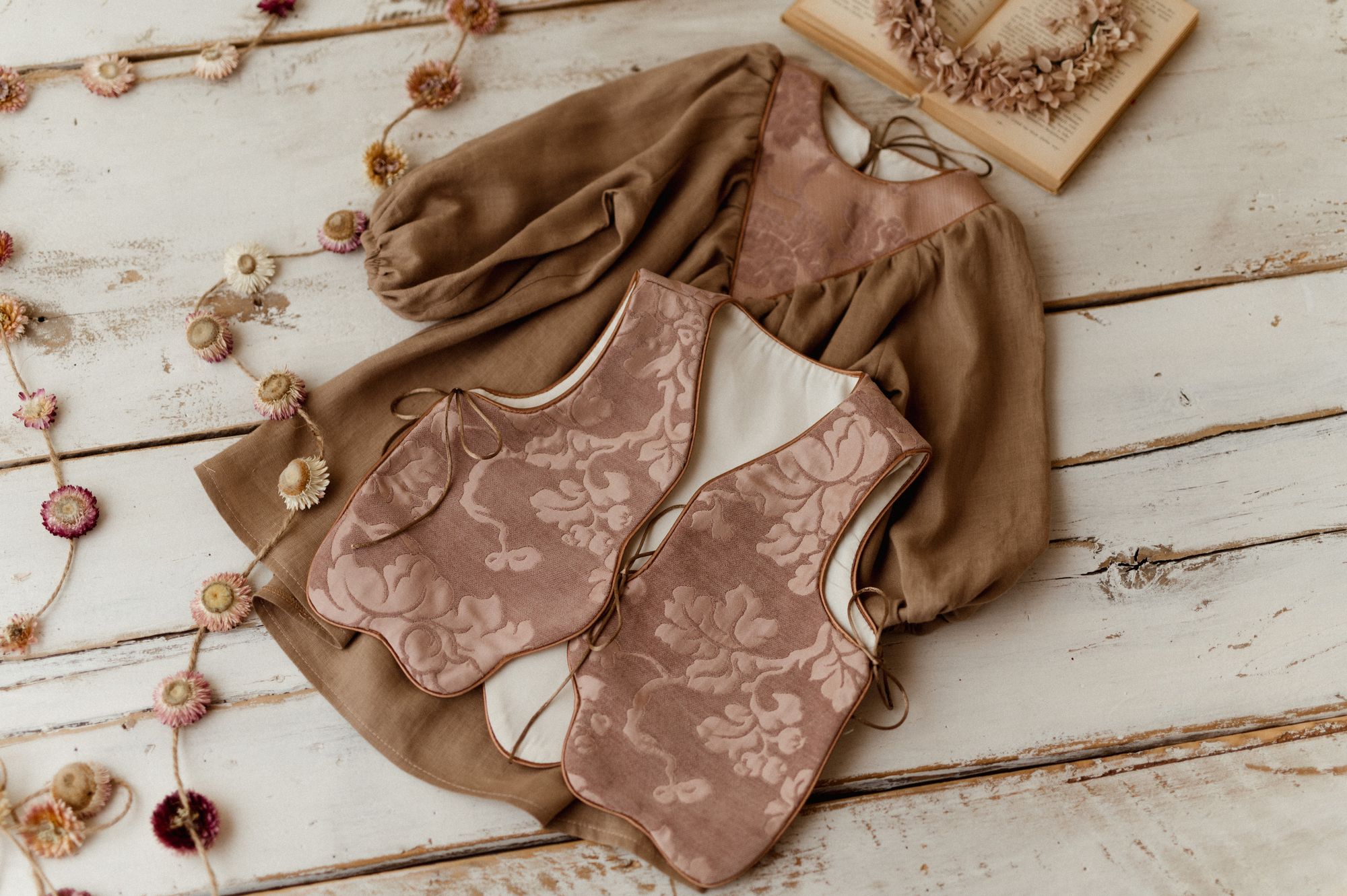 Retro beżowa sukienka lniana Marysia żakard kwiaty taupe 5-10 lat