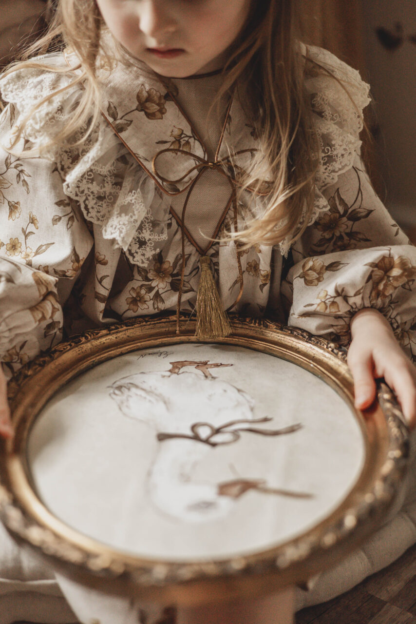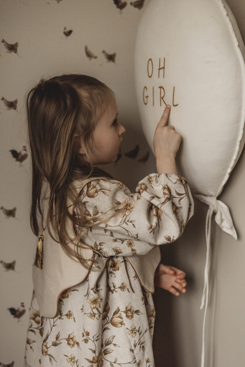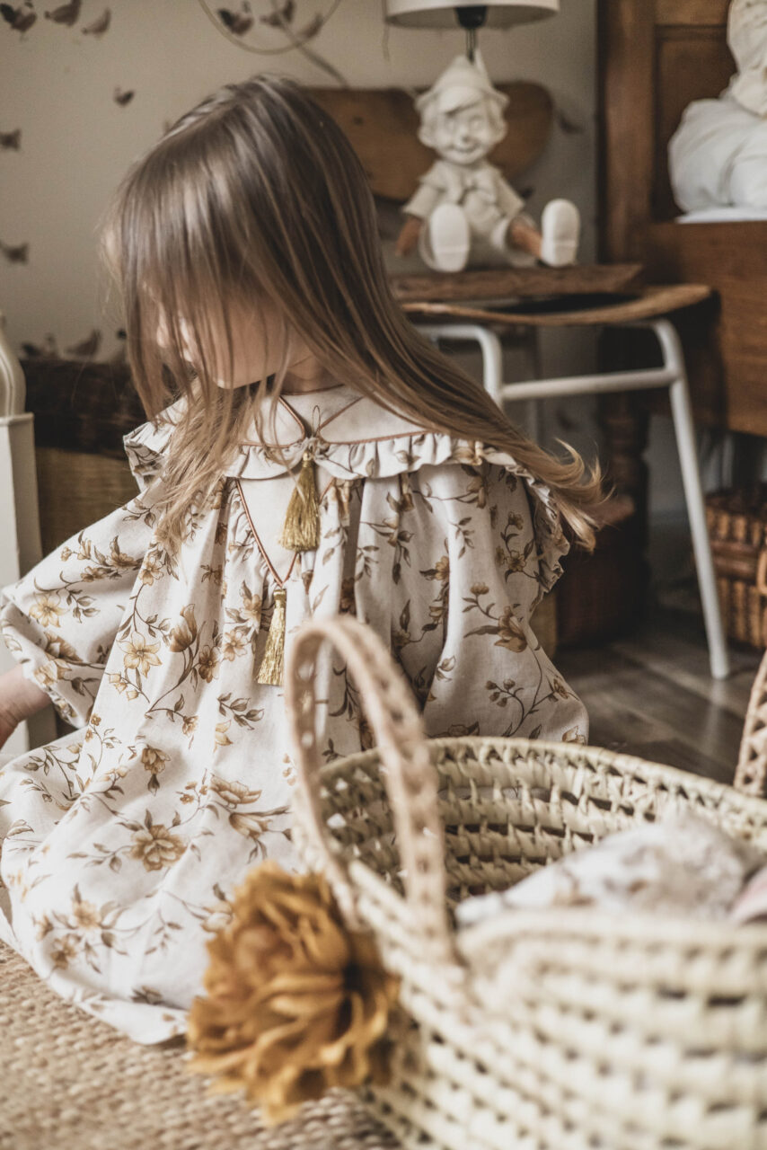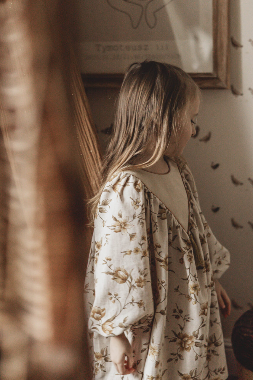 Retro sukienka lniana w kwiatuszki dla dziewczynki Marysia honey