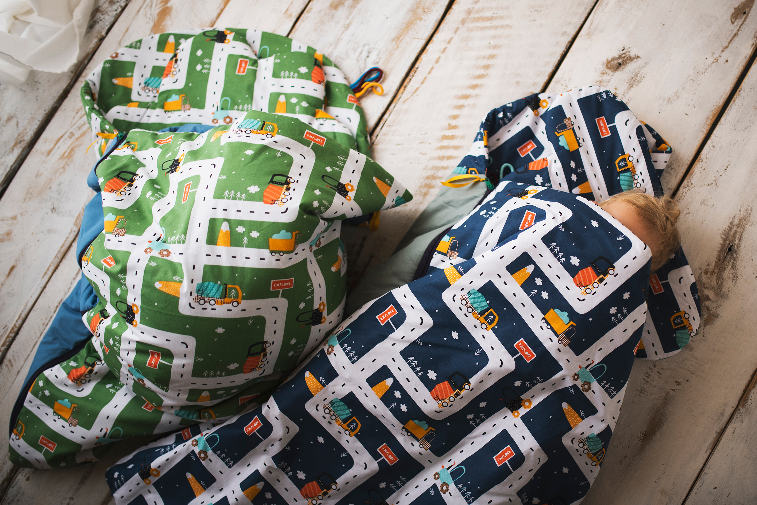 Śpiworek został zaprojektowany z myślą o dzieciach, które często się odkrywają podczas snu – zapewnia ciepło i komfort przez całą noc. Zarówno do śpiworka, jak i pokrowca, wszyto bawełniane tasiemki, na których można wpisać imię dziecka.