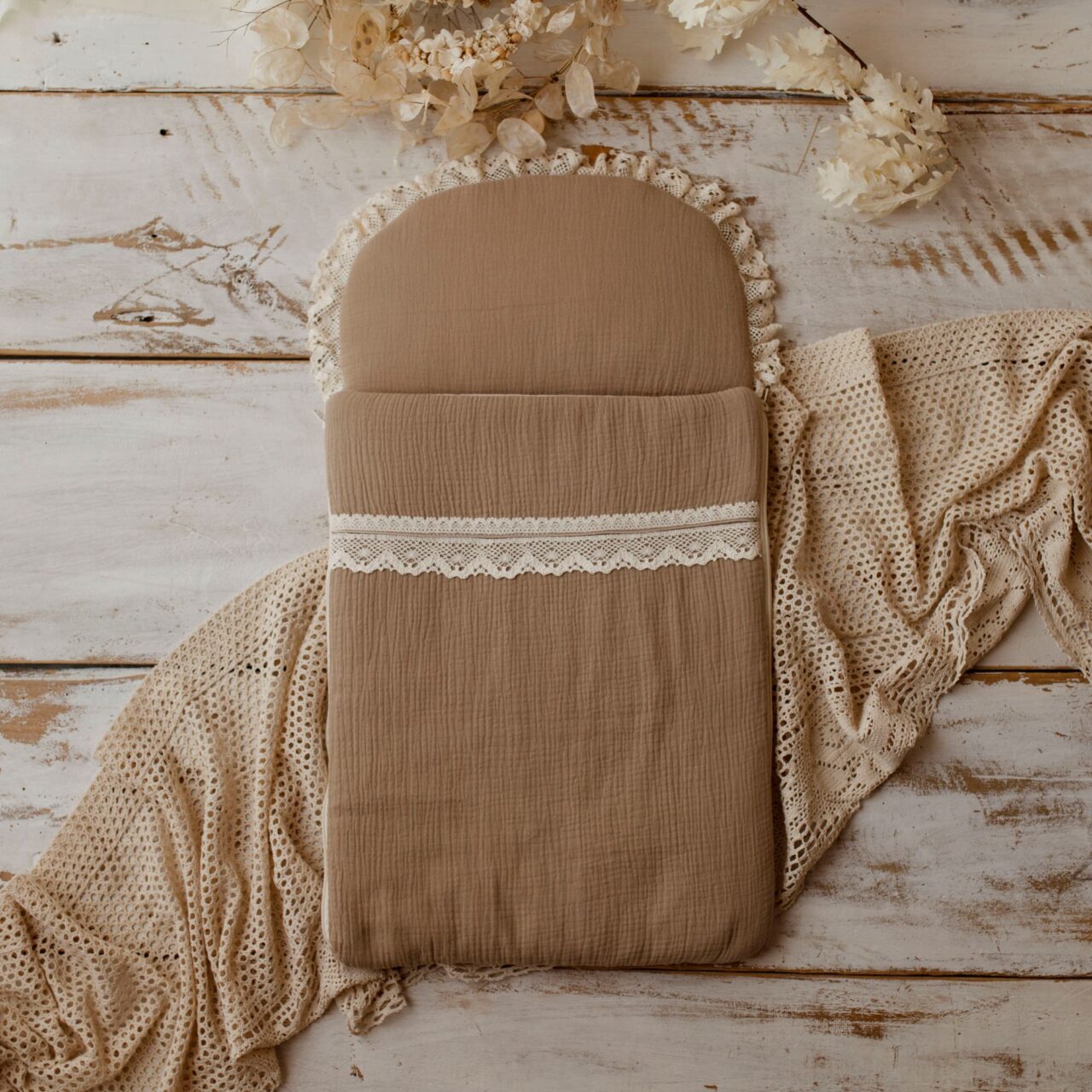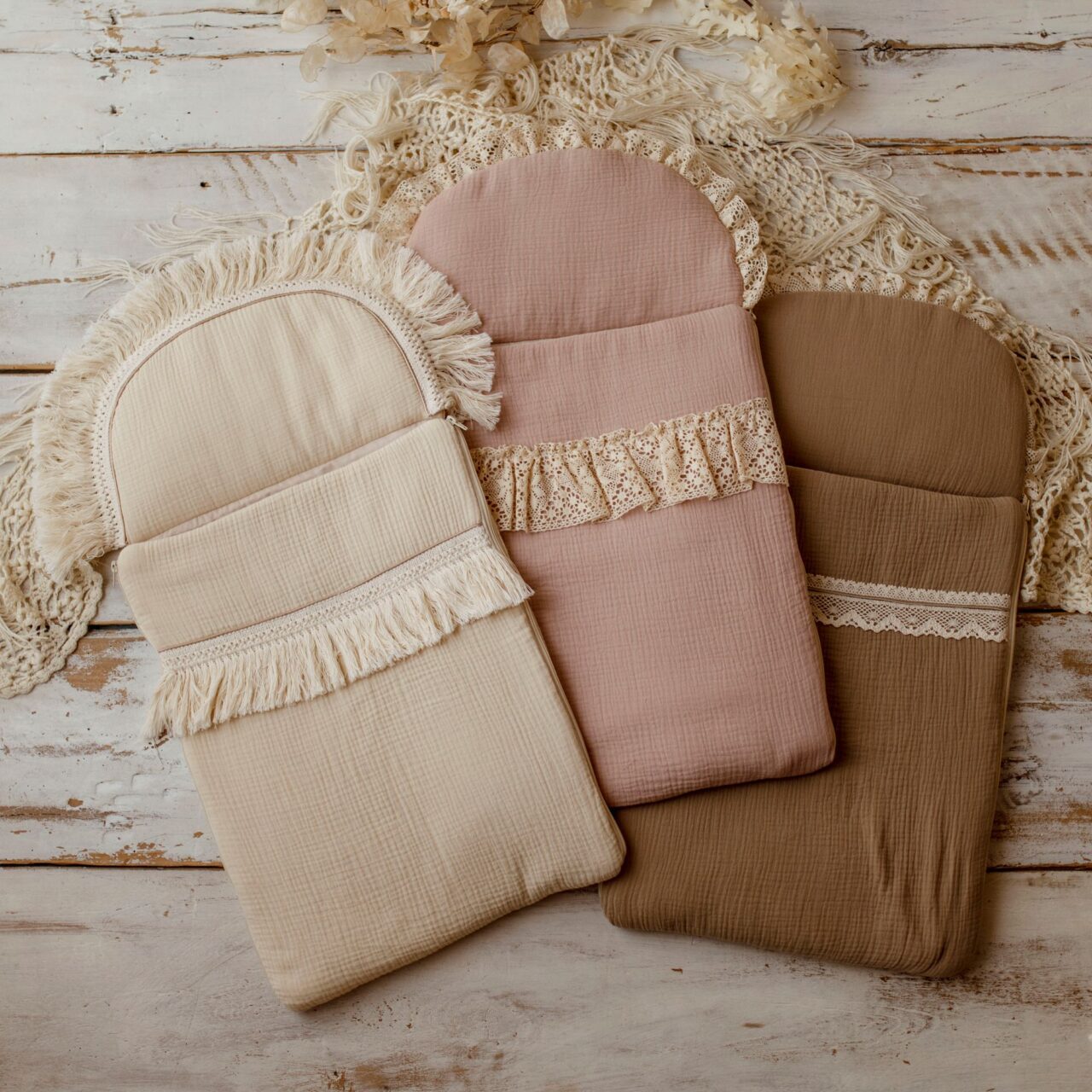 Każdy model śpiworka wykończony jest delikatnym zdobieniem – uroczą delikatną falbanką wykonaną z bawełny lub bawełnianej koronki. W naszej ofercie znajdziesz również zestaw boho wykończony uroczymi frędzelkami.