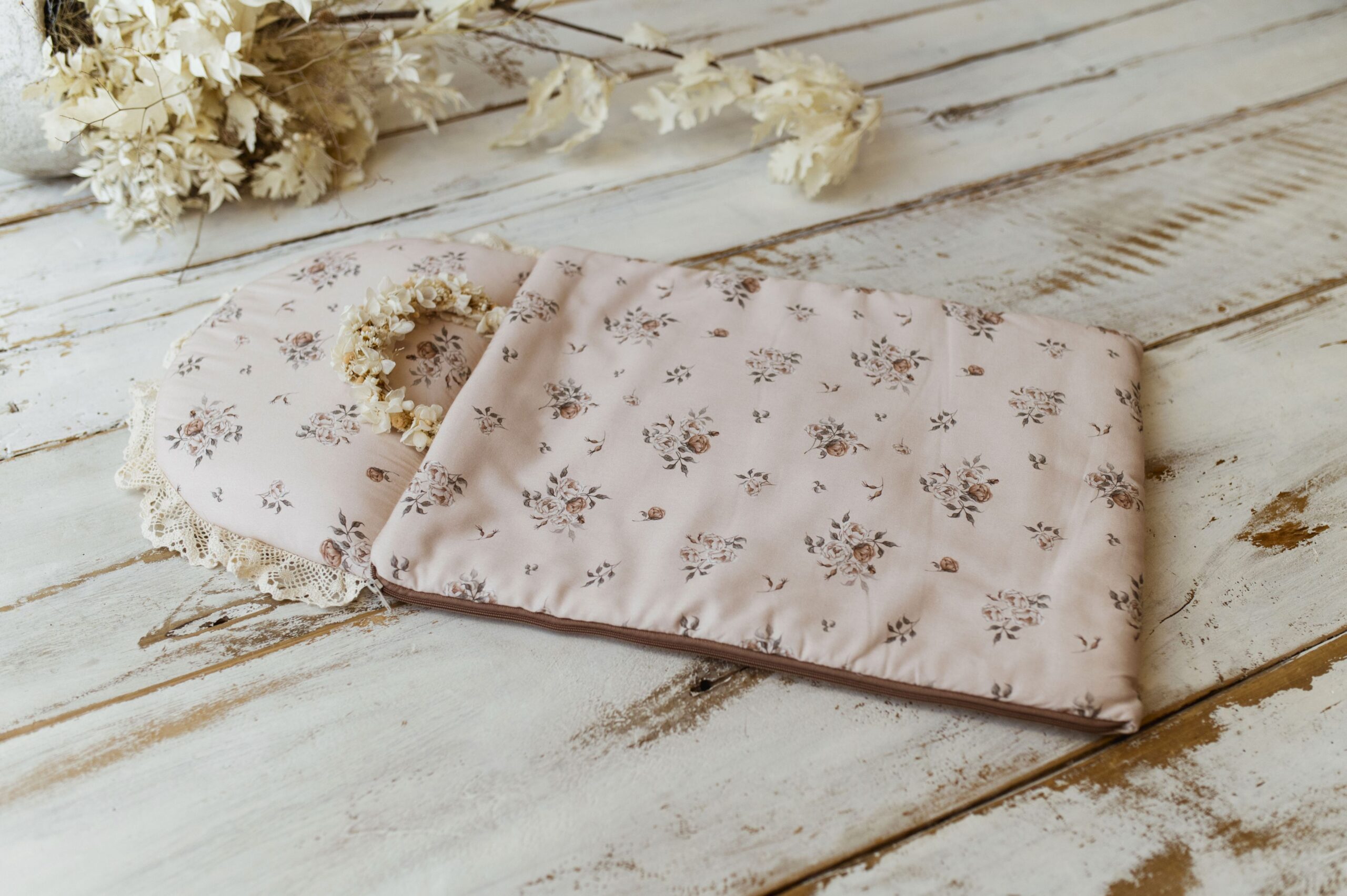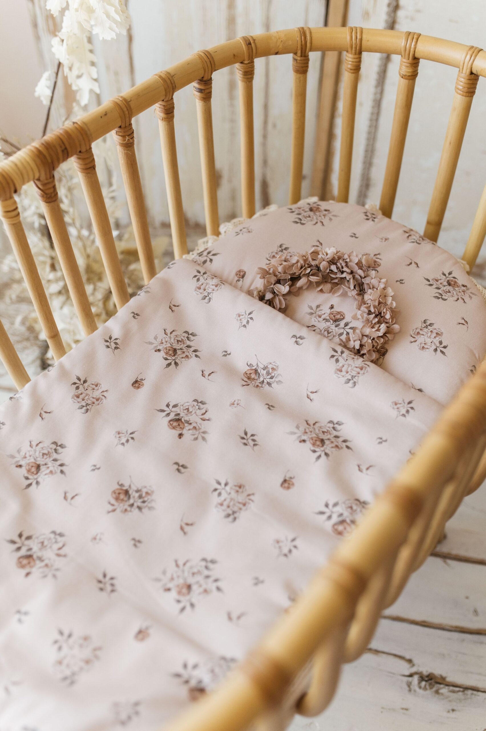Śpiworek został ozdobiony delikatną koronką bawełnianą, która nadaje mu romantycznego charakteru. Jasnoróżowy odcień tkaniny z subtelnym motywem kwiatowym doskonale wpisuje się w styl retro, wnosząc elegancję i ciepło do dziecięcej wyprawki.