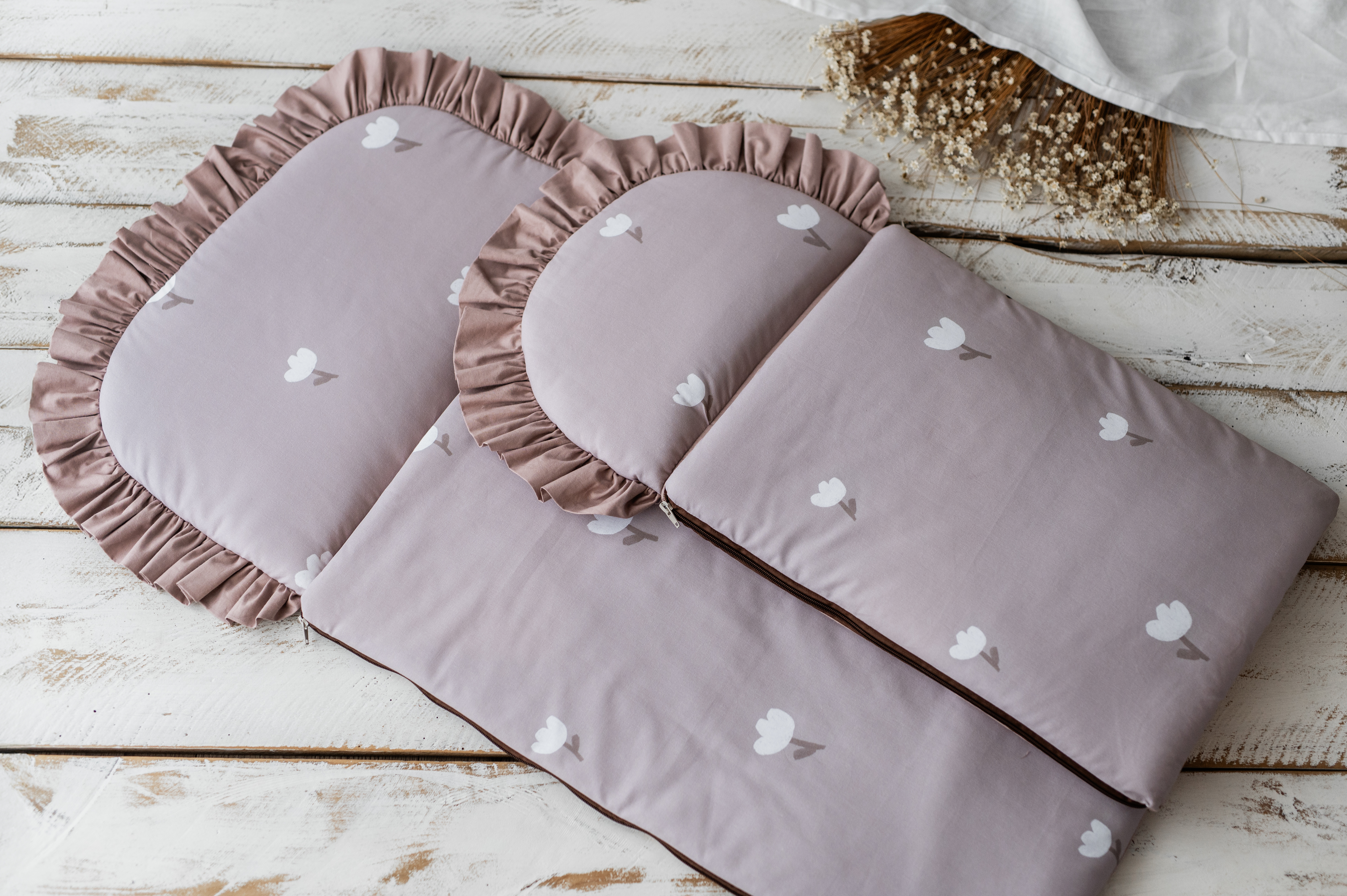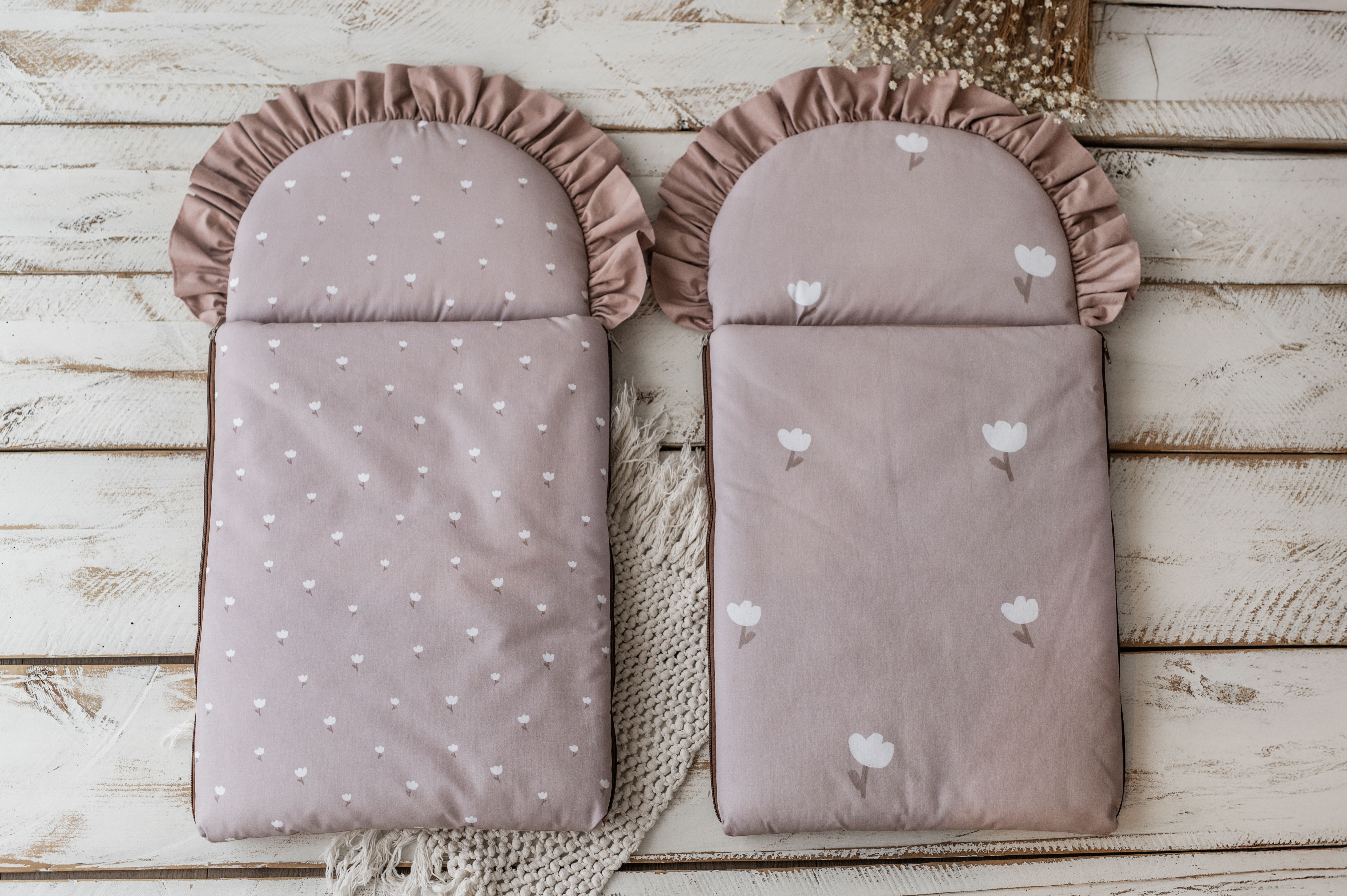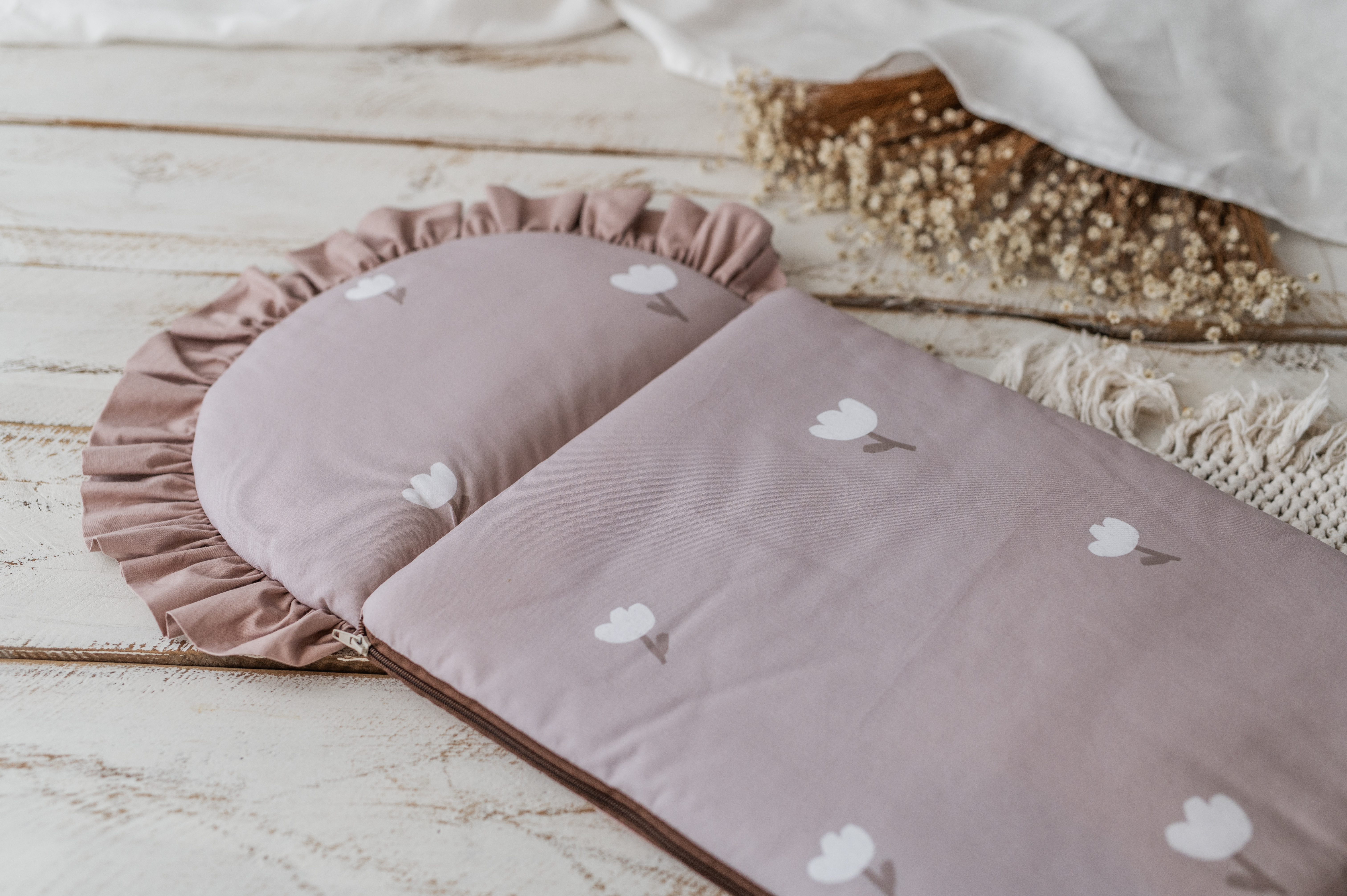 Każdy model śpiworka został wykończony uroczą falbanką, która dodaje mu elegancji i stylu. Motyw kwiatowy nadaje delikatności i romantycznego charakteru, idealnie wpisując się w dziecięce aranżacje.