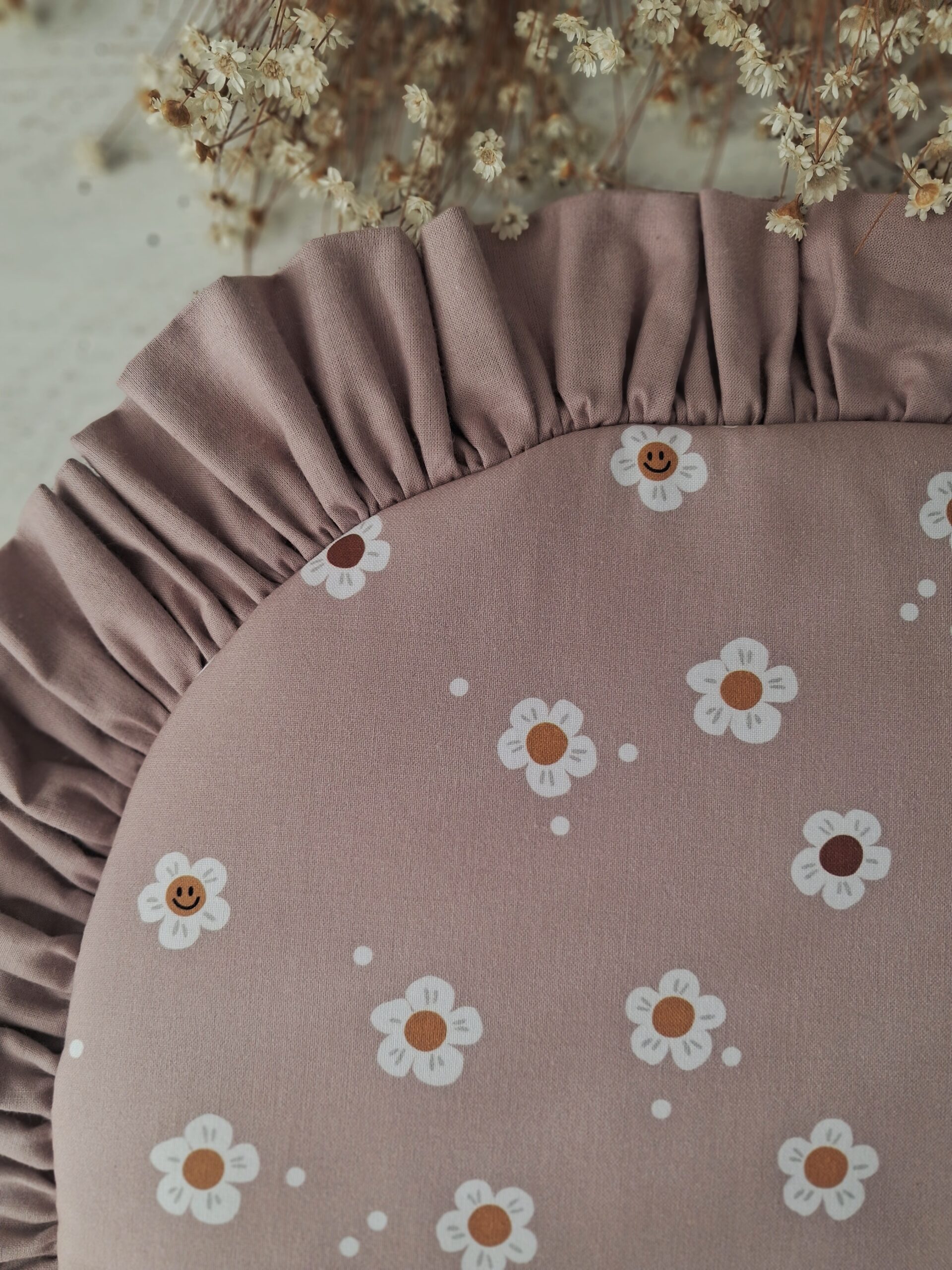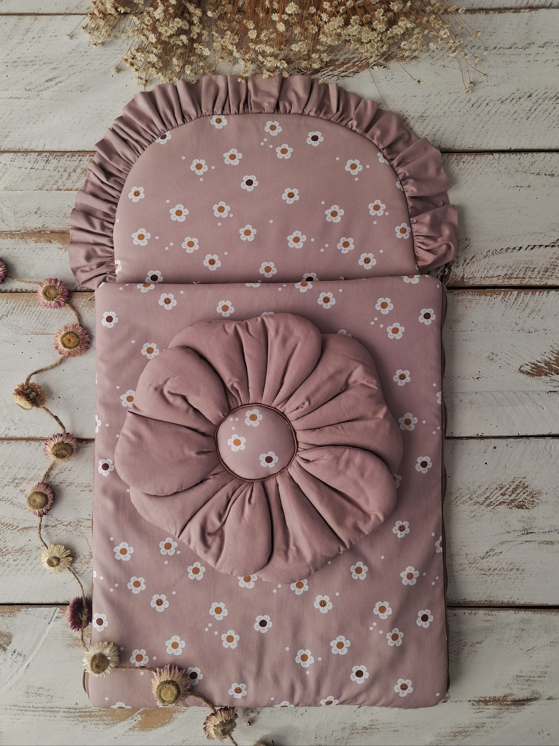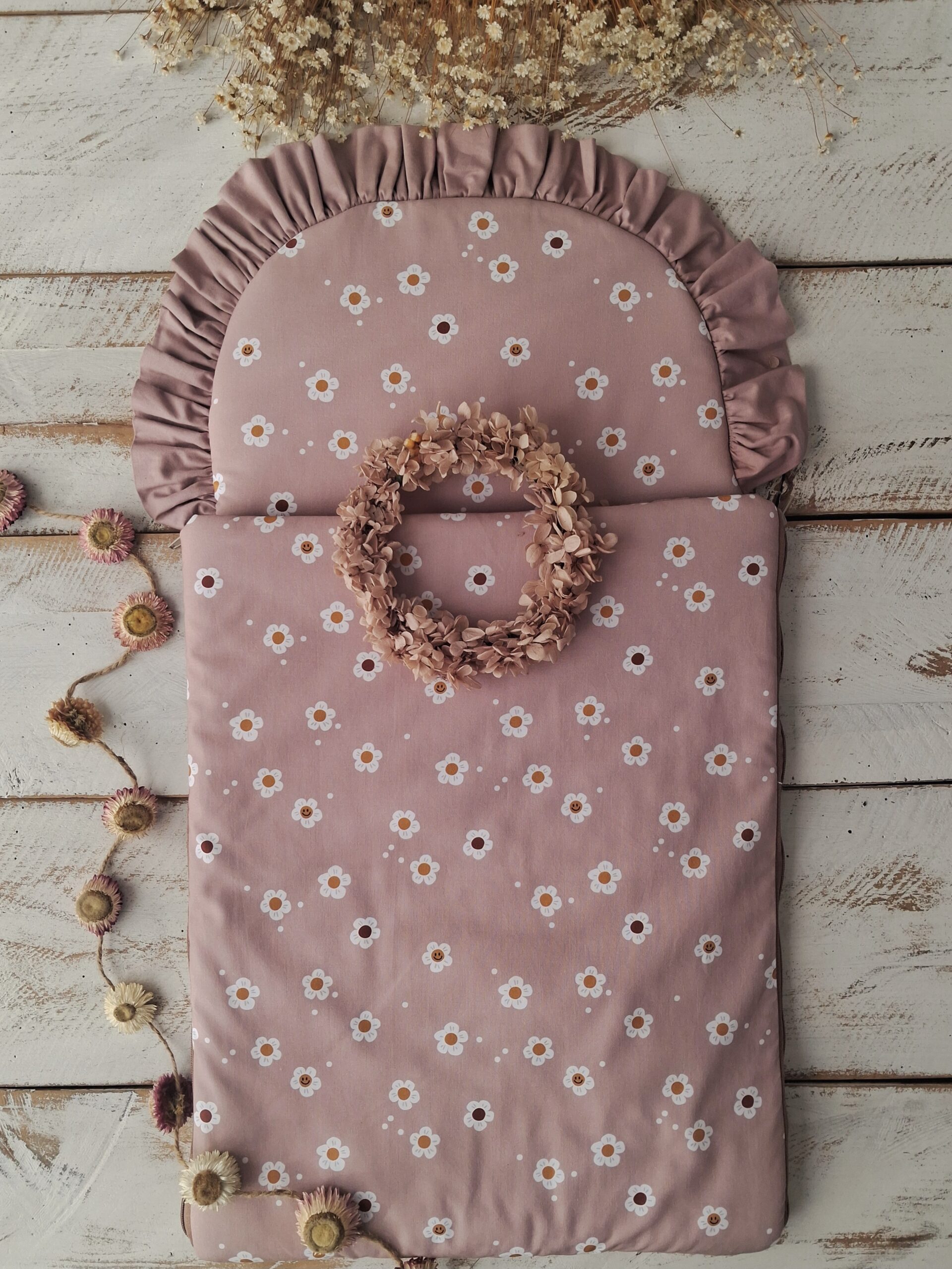 Każdy model śpiworka został wykończony uroczą falbanką, która dodaje mu elegancji i stylu. Motyw kwiatowy nadaje delikatności i romantycznego charakteru, idealnie wpisując się w dziecięce aranżacje.