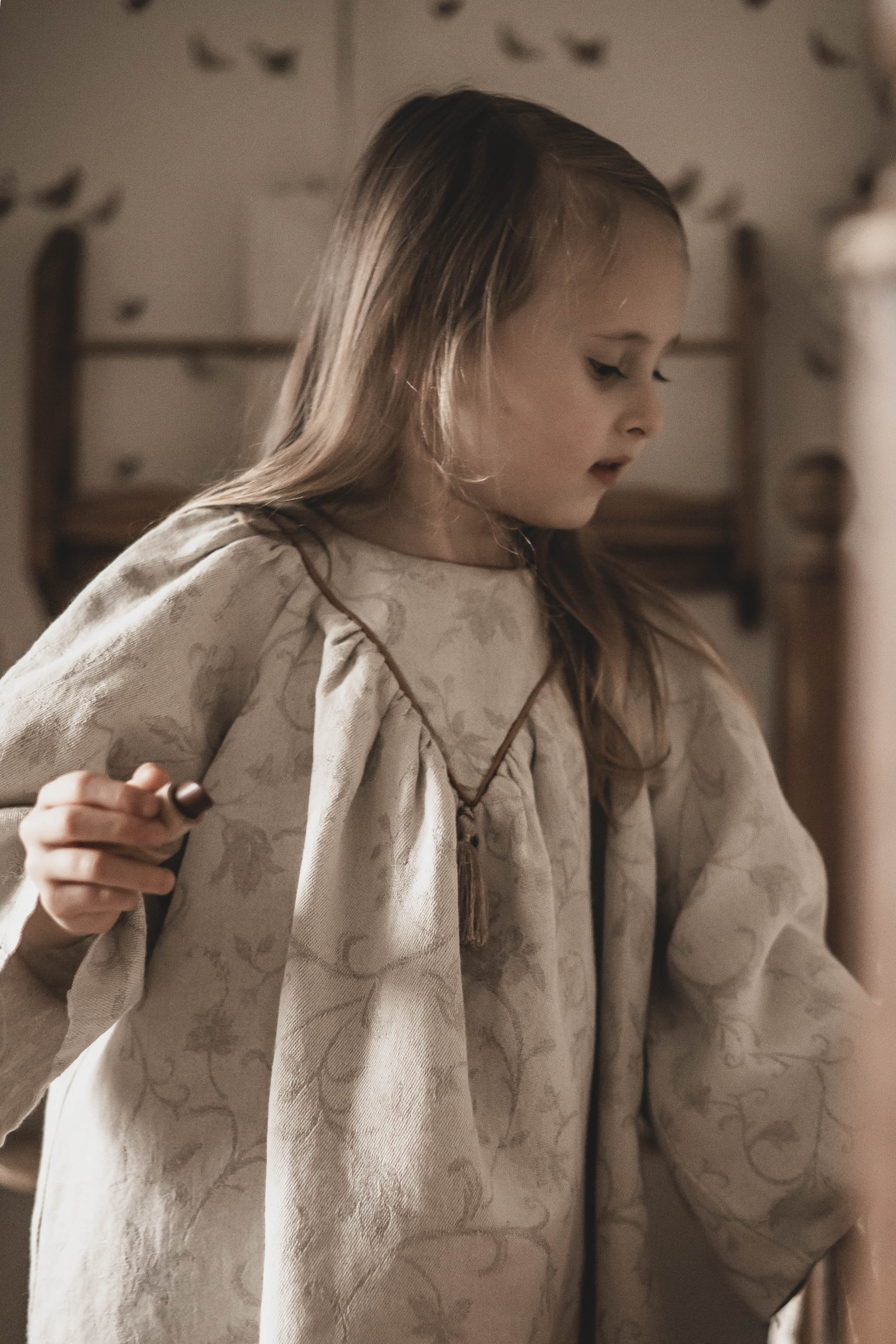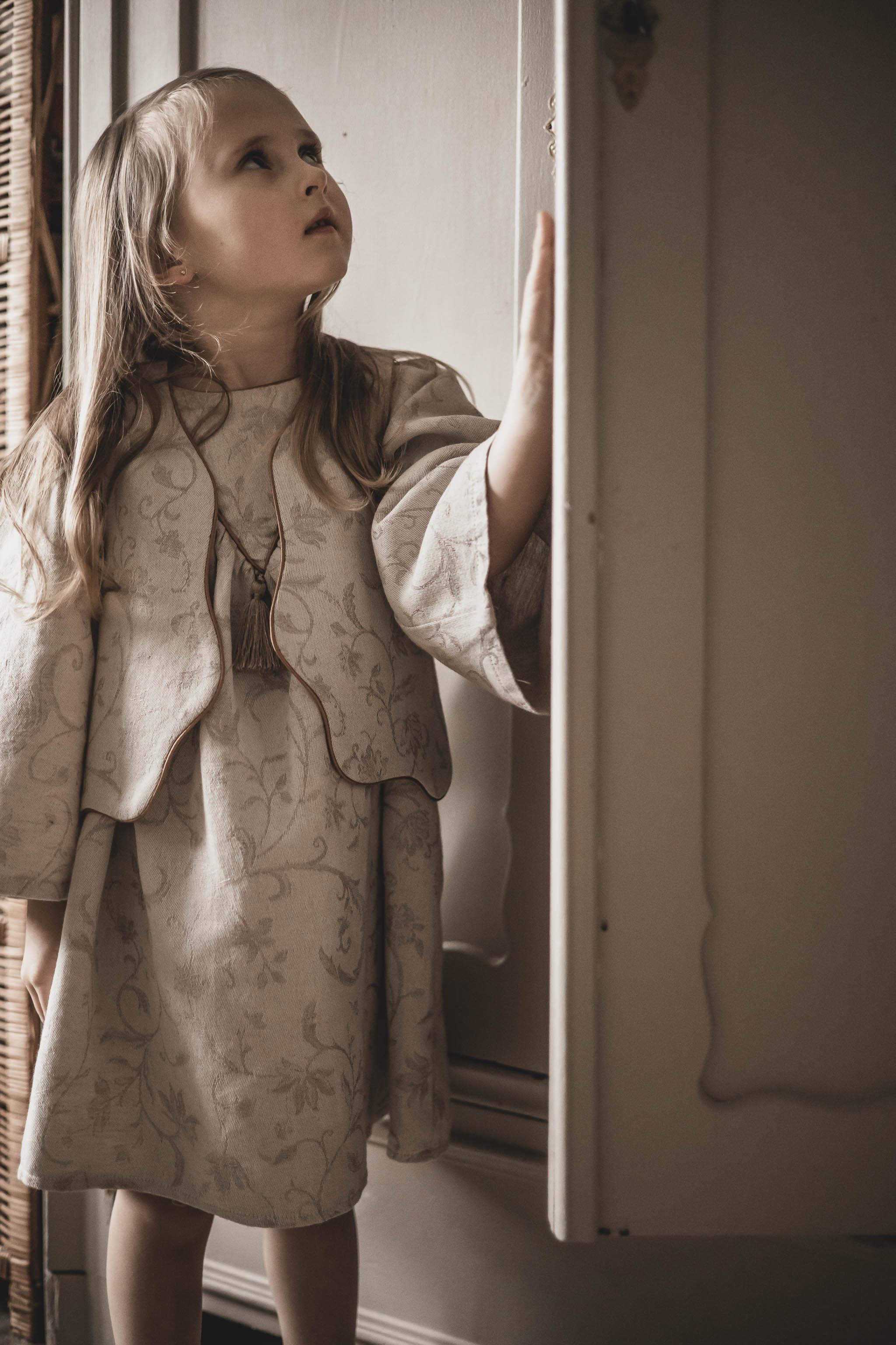 Luźny krój w formie sukienki do kolan z długimi rękawami zakończonymi gumeczką zapewnia komfort noszenia i swobodę ruchów. Całość dopełnia ozdobny żakardowy dekolt z elegancką wypustką i uroczym chwościkiem. Sukienka wiązana z tyłu – dzięki czemu zyskuje lekki, dziewczęcy charakter.