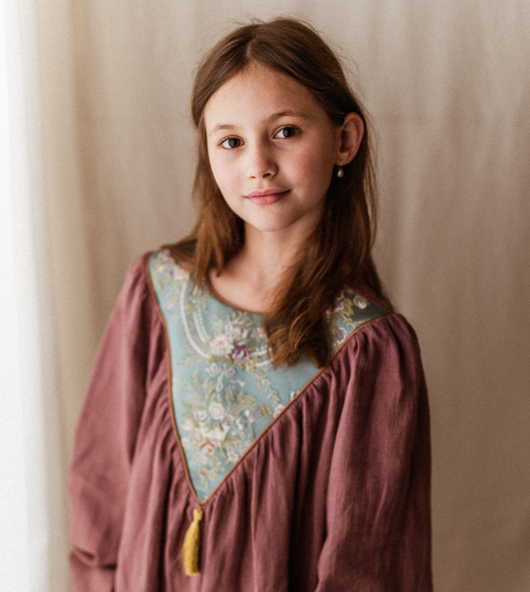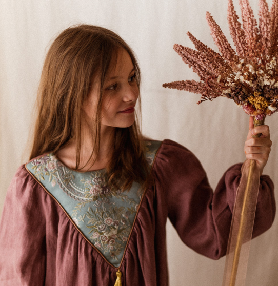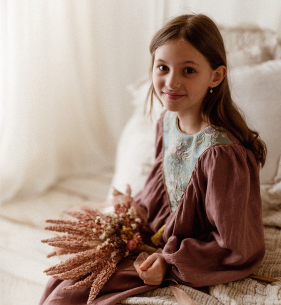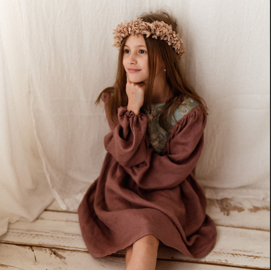 Sukienka lniana retro Marysia żakard kwiaty wrzos 1-4 lat