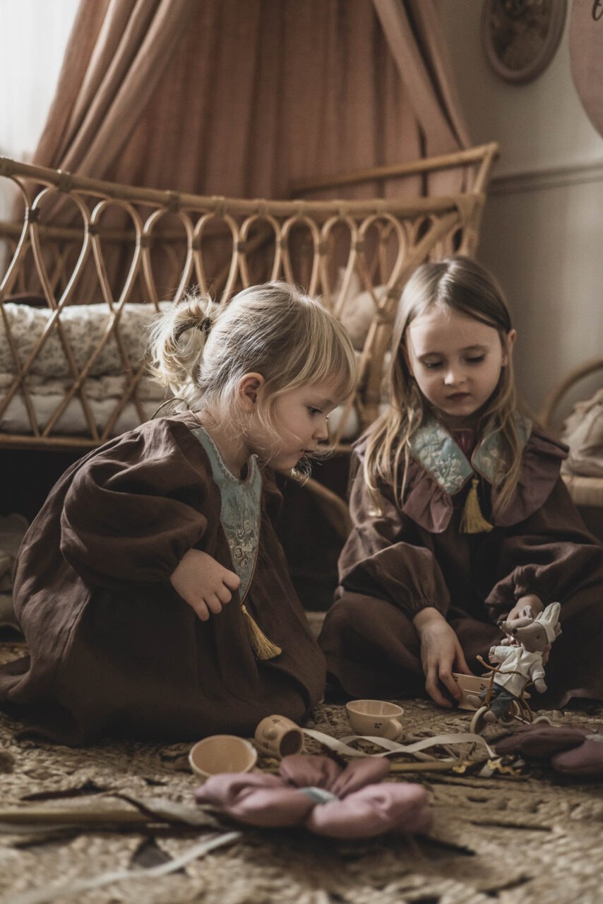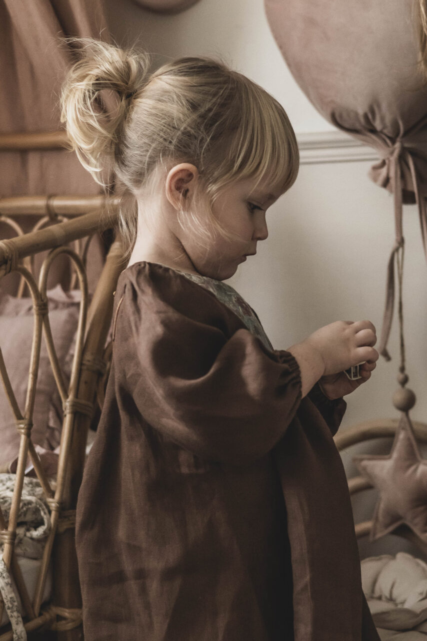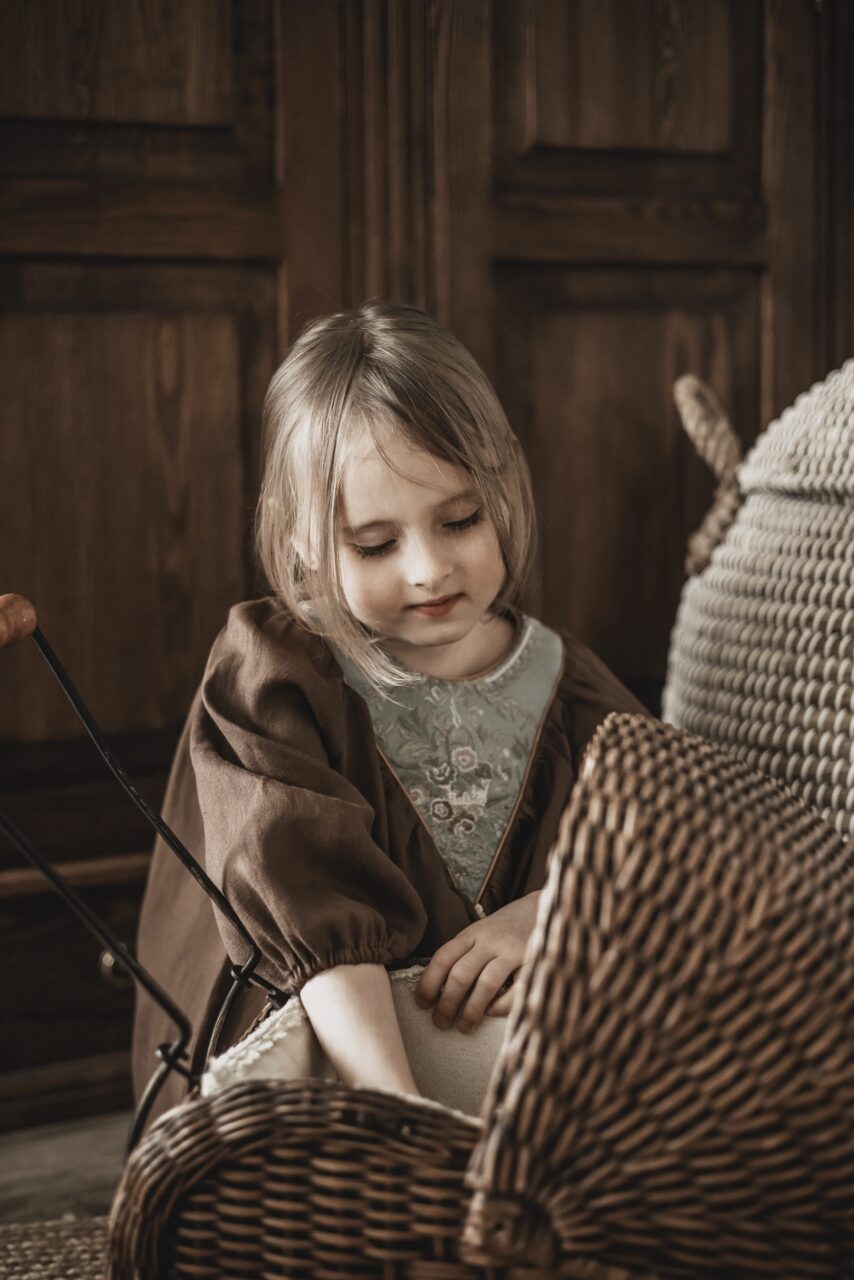 Vintage lniana sukienka brąz żakard dla dziewczynki Marysia