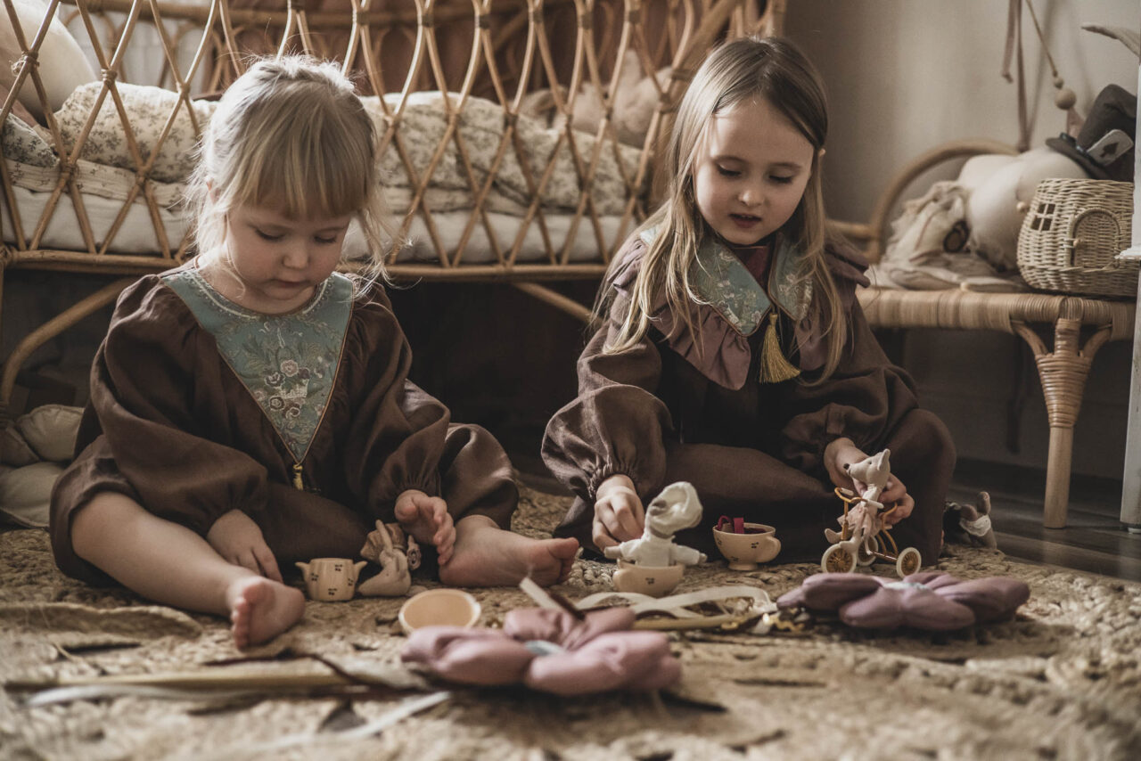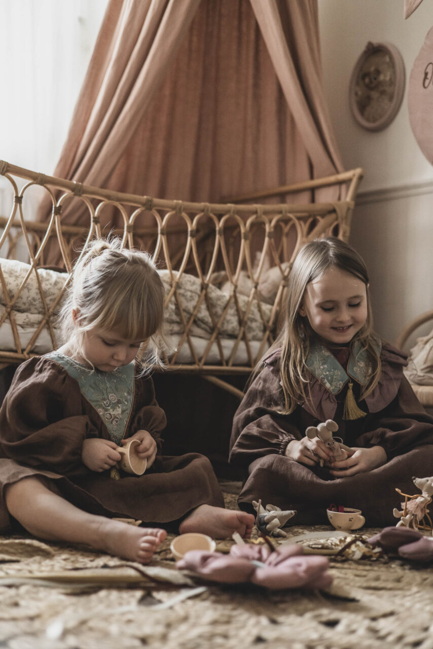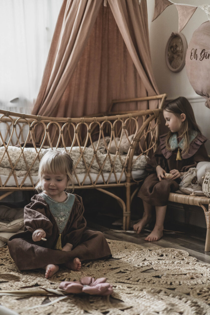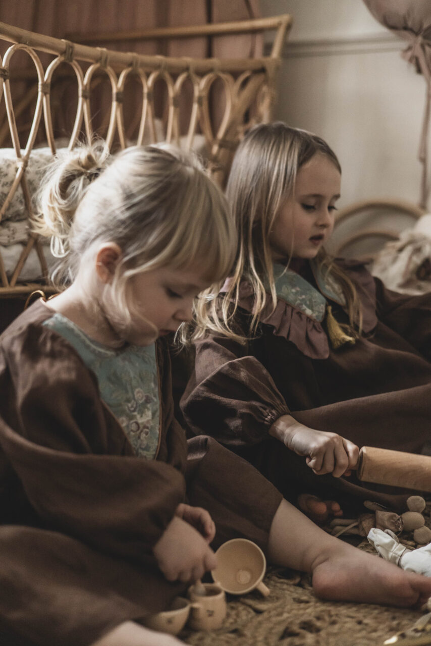 Vintage lniana sukienka brąz żakard dla dziewczynki Marysia