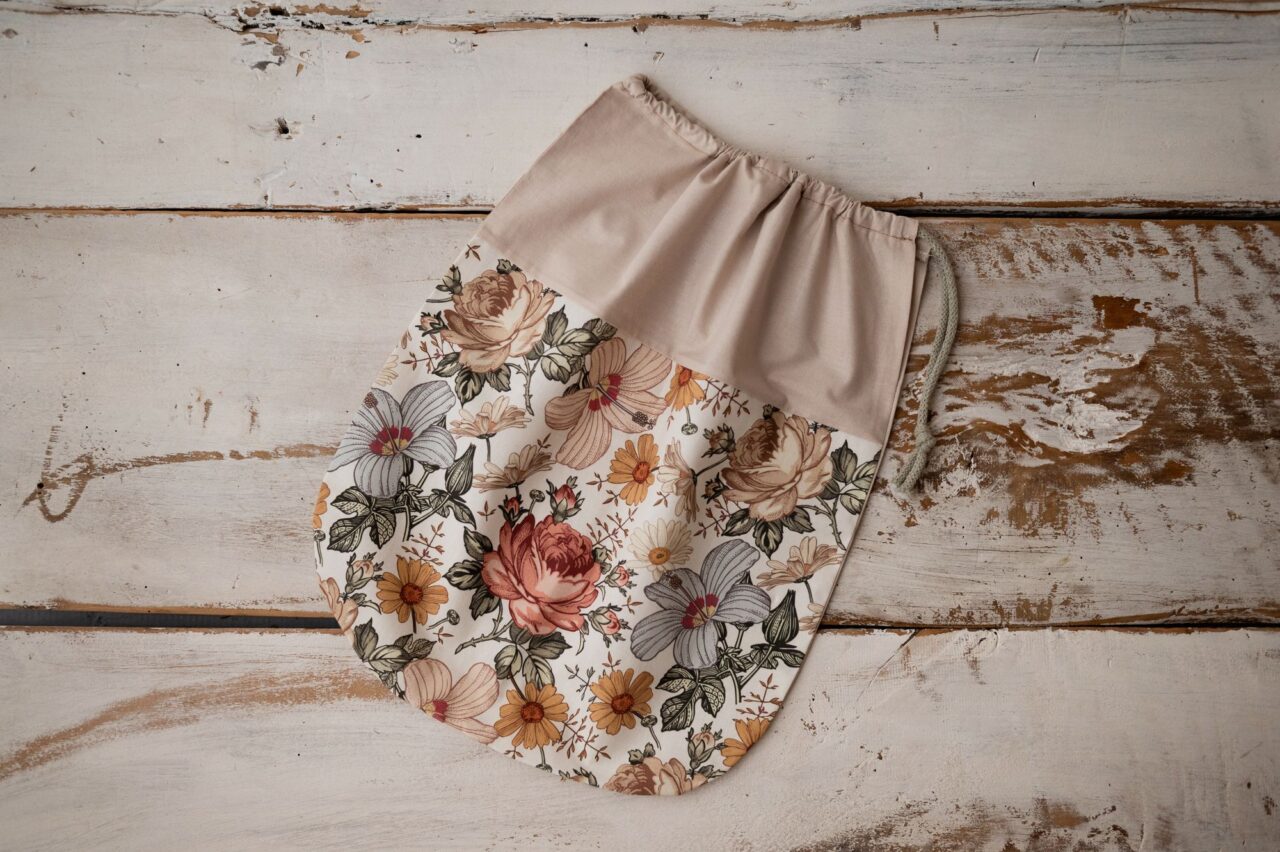 Woreczek w kwiaty do przedszkola bawełniany na rzeczy zamienne i buciki retro natural